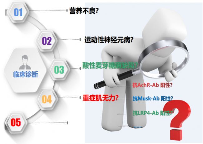 所幸,我們處在一個(gè)科技日新月異的時(shí)代,人類對(duì)生命醫(yī)學(xué)研究的腳步熱忱且經(jīng)久無(wú)息。隨著對(duì)重癥肌無(wú)力的持續(xù)研究,目前發(fā)現(xiàn)了重癥肌無(wú)力除了AchR-Ab之外,還存在其它的致病因子—肌肉特異性酪氨酸激酶抗體(MuSK-Ab)、低密度脂蛋白受體相關(guān)蛋白4抗體(LRP4--Ab)、抗蘭尼堿受體抗體(RyR-Ab)等......