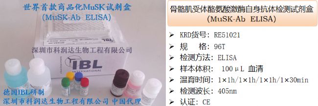 在此背景下,德國(guó)IBL首先推出了世界上第一個(gè)商品化且通過(guò)CE產(chǎn)品認(rèn)證的的MuSK-Ab試劑盒,由深圳市科潤(rùn)達(dá)生物工程公司作為中國(guó)代理。