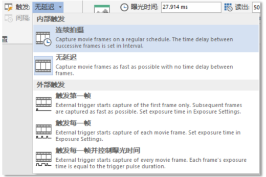 - 在OCULAR軟件界面設置相機曝光觸發光源,并且設置曝光時間。
