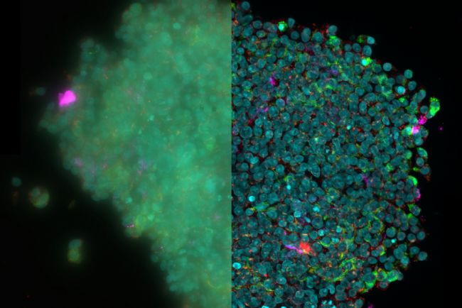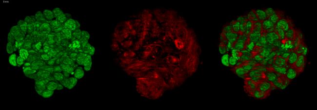 分離的人類胰島的三維重建:綠色的胰島素(AF488),紅色的胰高血糖素(AF555),洋紅色的IL-17 (AF647)和藍色的細胞核(Hoechst)Courtesy Prof. Von Herrath, San Diego, CA (USA)