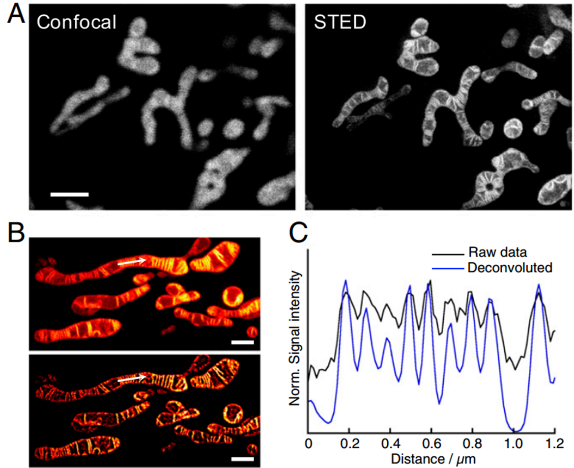 STED是基于STELLARIS共聚焦平臺純光學超高分辨技術,結合快速熒光壽命采集系統實現XY軸30nm分辨率極限。同時運用FLIM Phasor技術可顯著降低STED激光能量,適用于活細胞超高成像。TauSTED特別適合應用于組織和細胞內微小結構和物質的觀察,如膜蛋白與膜微結構域、細胞器內部的微小結構觀察、細胞骨架結構、神經元突觸研究、細菌內部的物質結構研究、病毒學研究、蛋白復合物研究等等。