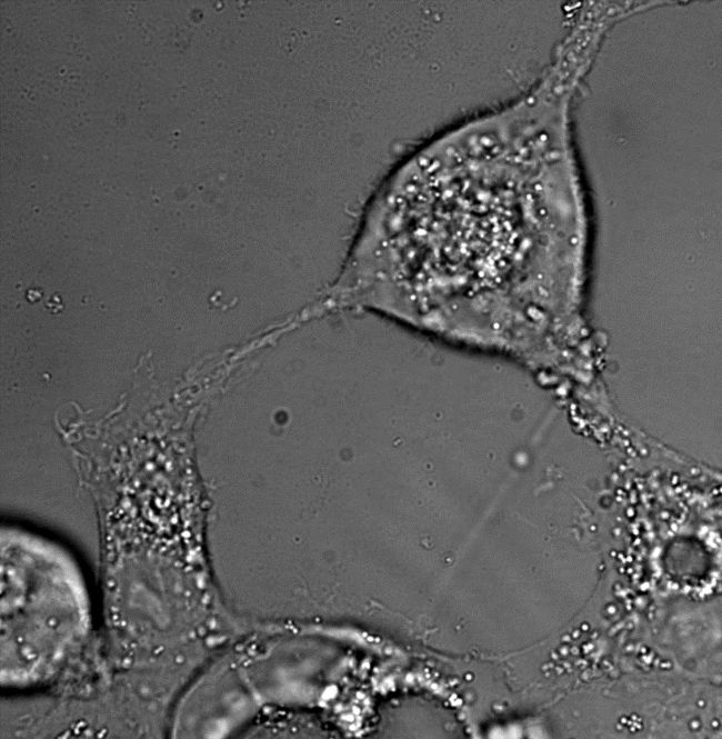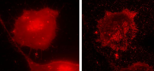 Hela細胞,使用Dil標記細胞膜(左圖普通熒光顯微鏡,右圖TIRF膜成像)