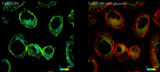 Fast FLIM image and FLIM phasor plot of U2OS cells labeled with Flipper TR, left cell in cell culture medium, right cell treated with 5% concentration glucose