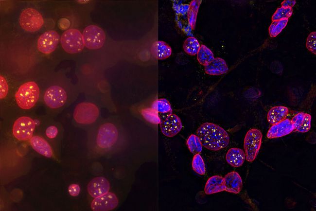 C2C12細胞生長和遷移到雙方transwell膜沾核纖層蛋白B(紅色)核結構,赫斯特(藍色)的DNA,和γH2AX DNA損傷(黃色)。細胞成像使用THUNDER活細胞培養成像系統與63X/1.4油浸物鏡。圖片上面代表擴展景深預測厚17.47µm z-stacks。圖片由美國加州大學戴維斯分校生物科學學院神經生物學、生理學和行為系盧卡斯·史密斯博士提供。
