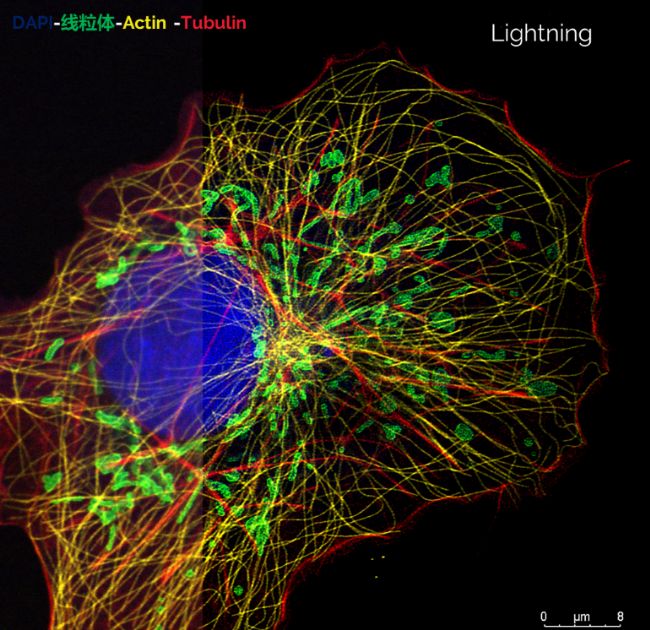 細胞生物學研究已經不再局限于細胞層面觀察,而是聚焦于亞細胞器、染色體、離子通道等細小結構,傳統寬場熒光顯微鏡雖然有成像速度快、光毒性低的有點,但是空間分辨率并不能滿足對亞細胞器更精細結構解析的分辨率需求。Leica STELLARIS Lightning超分辨系統基于共聚焦平臺,XY分辨率達到120nm,Z方向達到了200nm,超越了普通共聚焦光學極限。
