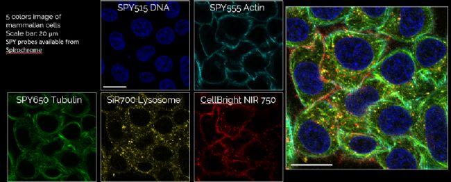 NE-115 cells. LifeAct-mNeonGreen (left: yellow, right: red), MitoTracker Green (left: yellow, right: green), NUC Red (left: gray, right: blue), and SiR-tubulin (left: gray, right: magenta).Courtesy: Max Heydasch, University of Bern and Spirochrome