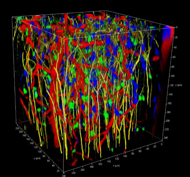 Blue: Astrocytes, Sulforhodamine;Green: Microglia, GFP;Yellow: Neurons, YFP;Red: Blood, Alexa680-Dextran 活體小鼠在體腦細胞多色成像