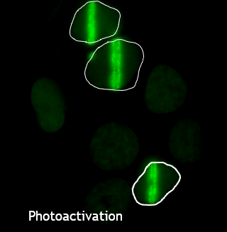 Hela Cells expression paGFP-H2B (histone marker). Courtesy Rebecca Smith, LMU, Munich.