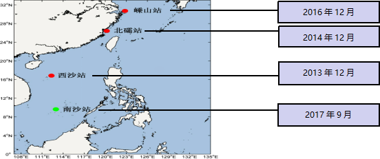 2013年至2017年間,建成了永暑島(南沙)、永興島(西沙)、北礵島(臺灣海峽)和嵊山島(長江口)4座海島基海洋大氣溫室氣體監(jiān)測站,并開展業(yè)務(wù)化觀測工作,初步形成了一個覆蓋中國近海的海洋大氣溫室氣體監(jiān)測網(wǎng),填補(bǔ)了中國近海海洋上空大氣溫室氣體高精度連續(xù)觀測數(shù)據(jù)的空白,是目前為止國內(nèi)唯一業(yè)務(wù)化海島基海洋大氣溫室氣體監(jiān)測網(wǎng),該監(jiān)測網(wǎng)的建成在《中國海洋報》被專欄報道。
