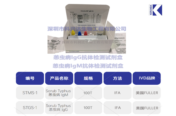STMS-1及STGS-1恙蟲病抗體ELISA試劑盒,以及FULLER品牌的OTG-100、OTM-100恙蟲病抗體IFA試劑盒,對國內恙蟲病科研中得到普遍應用,InBios品牌的STMS-1及STGS-1恙蟲病抗體ELISA試劑盒已在生產地通過FDA和CE認證。深圳市科潤達生物有限公司做為免疫試劑盒的專業供應商及技術服務商,可以為各地科研機構穩定快速供InBios和FULLER等品牌的試劑盒,歡迎您致電垂詢,了解更多技術與優惠信息。