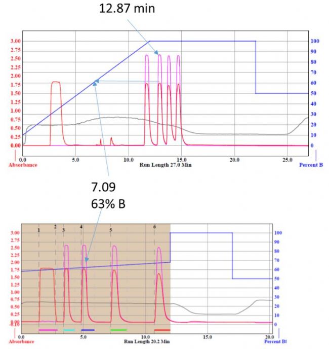 Teledyne Isco發明的“聚焦梯度”與其他品牌制備色譜計算梯度的程序相比,聚焦梯度的生成非常簡單、易用,最新的PeakTrak軟件允許用戶使用任何分析高效液相色譜系統來運行偵察梯度。當使用ACCQPrep®HP150的校準流程將系統駐留體積、柱體積和化合物洗脫時間的測量值合并到系統上,在使用ISCO的色譜柱情況下,校準僅需要7到10分鐘,(請參考Faster Method Development by Calibration of Analytical LC to ACCQPrep™ Systems,Chromatography Technical Note TN52, https://www.teledyneisco.com/en-us/liquidChromatography/Chromatography%20Documents/Technical%20Notes/Calibration%20of%20Analytical%20LC%20Systems.pdf)。
