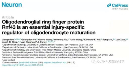 2021年8月13日,陸軍軍醫大學(原第三軍醫大學)牛建欽 教授 與加州大學舊金山分校Stephen Fancy教授團隊聯合在Neuron上在線發表題為 Oligodendroglial Ring Finger Protein Rnf43 is an essential injury specific regulator of oligodendrocyte maturation 的研究論文。