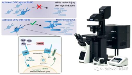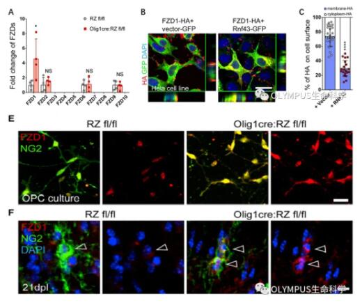 RNF43的表達受OPC中Wnt信號通路激活的調控,可標記患者腦內損傷部位激活的OPC。通過對RNF43作用機制的探索,發現RNF43可促進OPC細胞膜上Wnt信號受體Frizzled1(FZD1)的下膜,反饋性抑制Wnt通路的激活,調控OPC的分化成熟。同時,進一步針對FZD1的藥物干預能夠有效促進髓鞘再生。