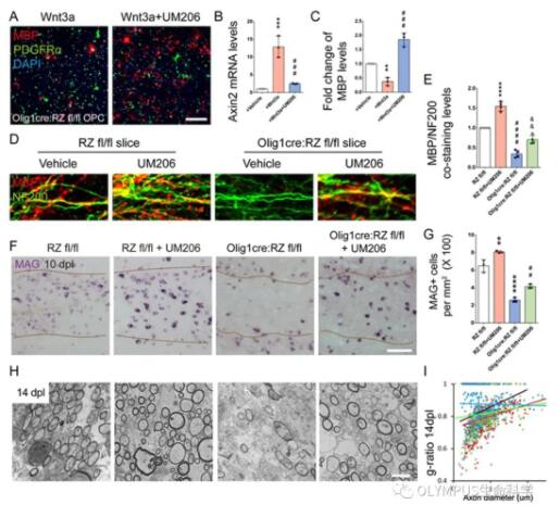 鑒于RNF43對FZD1的調控作用,作者進一步探究了藥物抑制FZD1是否可以促進髓鞘的再生。通過直接給藥、微量注射泵(Osmotic mini-pump)植入給藥等方法,作者在OPC培養模型、腦片培養模型、溶血卵磷脂誘導的髓鞘損傷模型中,給予FZD1選擇抑制性多肽UM206處理,證實UM206可以有效降低OPC的Wnt信號通路激活水平,促進OPC分化成熟和髓鞘再生(圖5)。