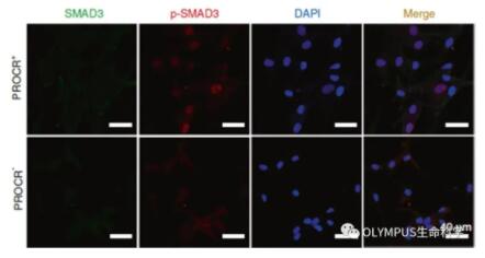 圖3:免疫熒光染色揭示PROCR+ 與PROCR- 亞群中p-SMAD3的表達差異