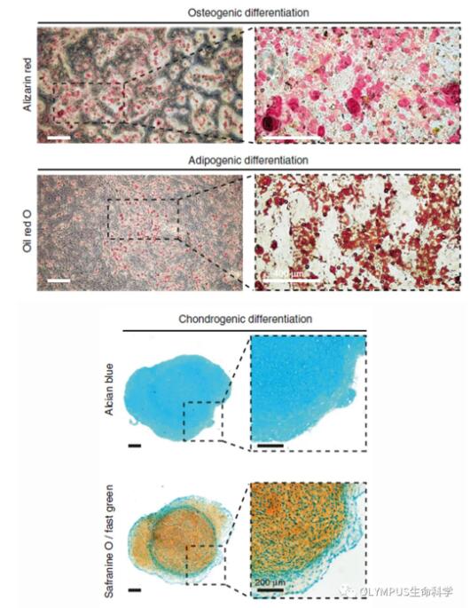 通過體外實驗,研究人員發(fā)現(xiàn)與PROCR-細胞亞群相比,PROCR+亞群具有很強的體外克隆形成能力。免疫熒光染色結(jié)果提示,在PROCR+細胞亞群中,軟骨生成相關(guān)轉(zhuǎn)錄因子p-SMAD3高度活化(圖3)。最后的體外分化實驗證實,PROCR+祖細胞具有成骨、成軟骨以及成脂的三系分化能力(圖4)。