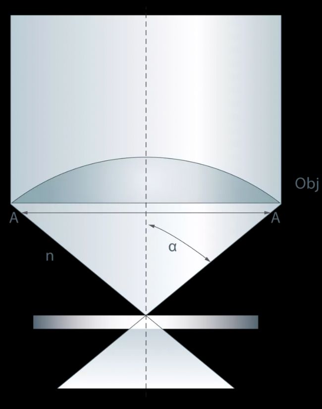 在以上公式中,‘n’為蓋玻片和物鏡前透鏡之間的介質折射率(例如空氣、水或油)。‘α’符號與光錐角的半角有關并且可通過透鏡進行收集(即孔徑角;見圖2)。