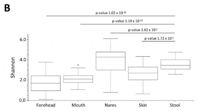 圖1. 患者不同部位的微生物譜、Shannon指數,及與AGP、ICU人群比較分析