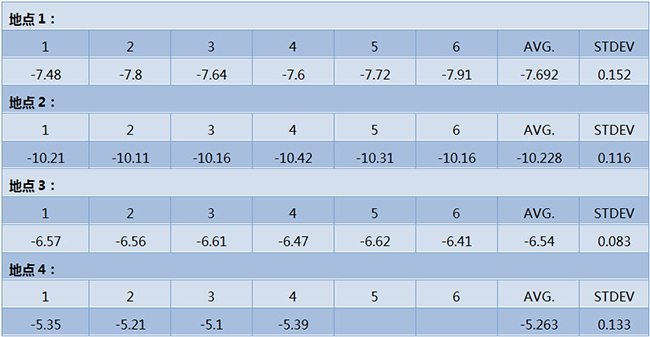 用現(xiàn)場(chǎng)采樣器從不同地方采集4組大氣樣品, 通過8070 AIR_CO2 和 IRMS進(jìn)行重現(xiàn)性測(cè)試,結(jié)果如下: