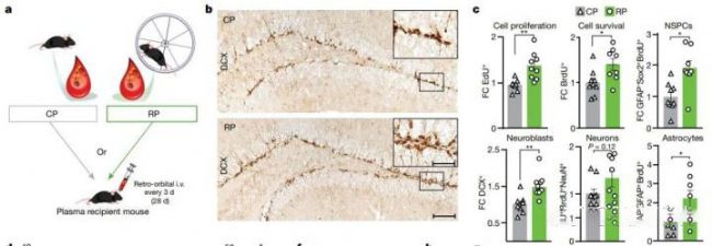 將長(zhǎng)跑小鼠的血漿注射給不運(yùn)動(dòng)的小鼠,可以促進(jìn)后者的大腦海馬區(qū)長(zhǎng)出更多新的神經(jīng)細(xì)胞;不運(yùn)動(dòng)小鼠的血漿則不起作用