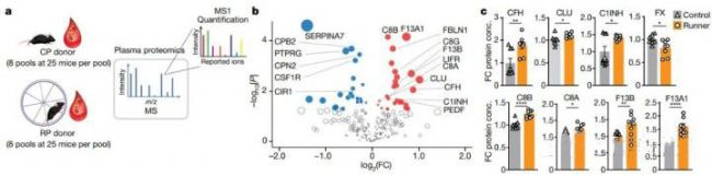 通過(guò)蛋白質(zhì)組學(xué)分析,他們鑒定出運(yùn)動(dòng)小鼠的血漿內(nèi)有235種蛋白的表達(dá)量與從不運(yùn)動(dòng)的小鼠有明顯差異。其中的大約30種蛋白質(zhì)引起了研究人員的注意,因?yàn)檫@組蛋白質(zhì)與免疫系統(tǒng)的補(bǔ)體級(jí)聯(lián)反應(yīng)有關(guān),也就是說(shuō)它們可以相互作用啟動(dòng)對(duì)病原體的炎癥反應(yīng)。