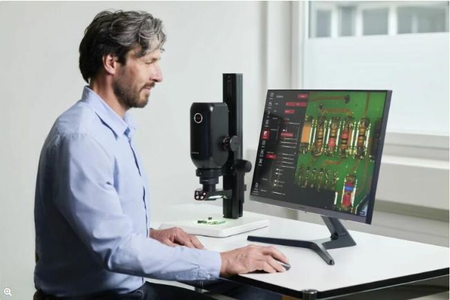 圖2:數(shù)碼顯微鏡為電子部件檢查提供了符合人體工程學(xué)的解決方案。此處示例為Emspira 3數(shù)碼顯微鏡。