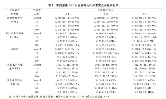 試驗結果:對照組及鋁處理組葉片的Fv/Fm 值無顯著性差異(P>0.05)。各 Al3+ 處理組與對照組葉片的Fv/Fm值在 0.80~0.83 之 間,屬 正 常 范 圍。100μM Al3+處理3d的蠶豆幼 苗 葉 片 中Fv’/Fm’值 降 低,與 對 照 組 及 10μM、50μM處理 組相比差異顯著(P<0.05)。6d后,盡管各 Al3+處理組與對照組的 Fv’/Fm’值無顯著差異(P>0.05),但Al3+處理組 Fv’/Fm’值低于對照組。50μM 和100μM Al3+ 處理9d后,幼苗葉片中的Fv’/Fm’值比對照組顯著降低(P<0.05)(表1)。