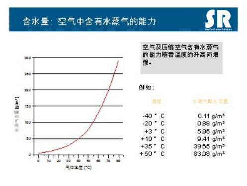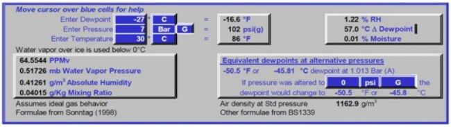 GB50751對空氣的含水量有明確的規定,參見上表。從下面的圖表,可以很清晰的看到壓力露點,露點,相對濕度,PPMv以及絕對濕度的關系。