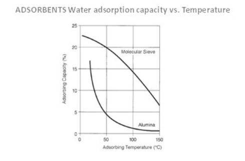 從上面的曲線我們可以看到,吸附劑的吸附能力隨著溫度的升高而下降。其中對氧化鋁來說,當溫度達到50℃時,其吸附能力大大下降。所以一般來說,吸附式干燥機的標準進氣溫度是35℃。