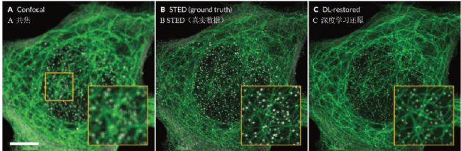 雙色共焦圖像的分辨率增強。訓練用的原始圖像在Leica SP8系統上拍攝,(A)共焦模式的核孔復合物(白色)和微管(綠色);(B)STED模式拍攝的圖像。(C)使用深度學習模型將共焦圖像的空間分辨率提升到接近STED質量。