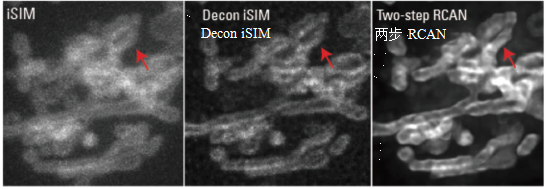 表達EGFP-Tomm20的U20S活細胞圖像。高放大倍率視圖,原始iSIM、去卷積iSIM和 RCAN預測進行比較。紅色剪頭表明RCAN可以比iSIM更好地解析線粒體。圖片來源:Nature Methods