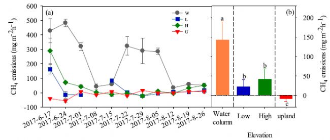 不同海拔下CH4排放的周平均值以及整個非淹水期土壤CH4排放量。