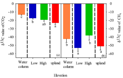 作者于2017年6-8月測量了土壤/水大氣界面CO2和CH4的交換率。利用ABB LGR CO2同位素分析儀分析CO2的濃度及δ13C,并利用ABB LGR甲烷碳同位素分析儀分析CH4的濃度及δ13C。