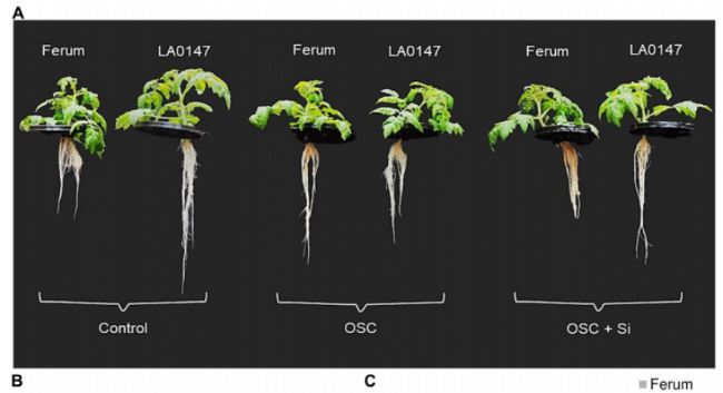 此前的研究表明,硅(Si)在減輕干旱脅迫對不同作物物種的不利影響方面發(fā)揮了作用。然而,缺乏關(guān)于耐旱和抗旱作物品種對硅營養(yǎng)反應(yīng)的比較數(shù)據(jù)。因此,本研究旨在闡明滲透脅迫條件下兩種不同番茄基因型對硅營養(yǎng)的反應(yīng)機制。在聚乙二醇(PEG,6000)和兩種硅(0和1.5mm)條件下水培生長了兩個對干旱脅迫反應(yīng)不同的番茄品系。代謝物分析分兩行進行。還測量了生長和相關(guān)生理參數(shù),以及所選基因的表達(dá)水平。施硅提高了耐旱系LA0147和干旱敏感系FERUM的滲透脅迫耐受性。在耐旱系中,硅提高了硫(S)和銨(NH+4NH4+)的吸收,從而顯著提高了氨基酸精氨酸、蛋氨酸、絲氨酸和甘氨酸的產(chǎn)量。而在干旱敏感品系中,Si顯著增加了氨基酸脯氨酸和GABA的產(chǎn)生,從而進一步降低了GSSG與GSH的比例,從而平衡了滲透脅迫下的氧化還原穩(wěn)態(tài)。氨基酸精氨酸、蛋氨酸、GABA和脯氨酸的大量產(chǎn)生促進了游離多胺腐胺和亞精胺的產(chǎn)生,并提高了滲透脅迫耐受性。因此,我們得出結(jié)論,Si通過相關(guān)氨基酸的差異積累,在兩個不同的番茄基因型中顯著調(diào)節(jié)滲透脅迫耐受性,最終導(dǎo)致多胺代謝增強。