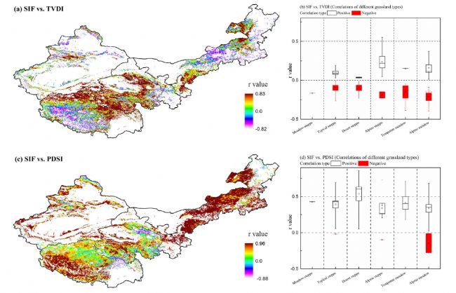 圖1:SIF 和 TVDI (a) 以及 SIF 和 PDSI (c) 之間相關系數 (r 值) 的空間分布。 不同草地類型的 SIF 和 TVDI (b) 以及 SIF 和 PDSI (d) 之間的修正值(r 值)。