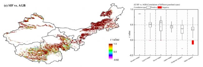 圖2:年度時間尺度上 SIF 和 AGB 之間 r 值的空間分布。 不同草地類型的 SIF 和 AGB (f) 之間的校正值 (r 值)。