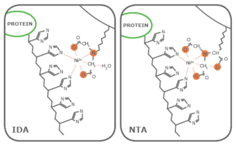 圖 2. IDA 與 NTA 螯合配體次氮基三乙酸(NTA)和亞氨基二乙酸(IDA)提供多聚組氨酸標(biāo)簽的 Ni² + 和咪唑環(huán)之間的相似相互作用,但 NTA 使 Ni² + 具有 4 個價態(tài)而IDA 僅具有 3 個(橙色圓圈)。這種差異會影響所得純化蛋白級分的質(zhì)量。