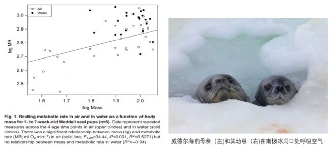 Fig.1. 1至7周齡海豹幼體在水中和空氣中靜息代謝率與體重之間的函數關系(空白圓圈為空氣中測試結果,黑色實心圓為水中測試結果)。水中代謝率和體重之間呈非異速生長且不顯著,空氣中靜息代謝率與體重關系顯著,且遵循log(MR