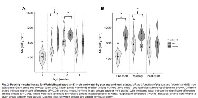 研究結果認為,空氣中的絕對代謝率(MR)遵循預期的異速生長與體重的關系。水中的絕對MR與體重沒有異速生長,盡管在1至7周齡之間體重增加了3倍。發育階段(或蛻皮階段),而不是日歷年齡,決定了幼體何時能夠在水中保持熱量。蛻皮后幼體在空氣和水中的RMR(分別為6.67±1.4和7.90±2.38mlO2 min-1 kg-1)低于蛻皮前幼體(空氣中:9.37±2.42 ml O2 min-1 kg-1,水中:13.40±3.46ml O2 min-1 kg-1)和蛻皮幼崽(空氣中:8.45±2.05 ml O2 min-1 kg-1,水中:10.4±1.63ml O2 min-1 kg-1)。盡管能量投入增加,但蛻皮時的幼體在水中花費的時間是其他幼體的三倍。這些結果支持了在早期發育期間海豹幼體進行能量權衡的想法;幼體消耗更多的能量在水中調節體溫,同時獲得獨立所需的經驗。