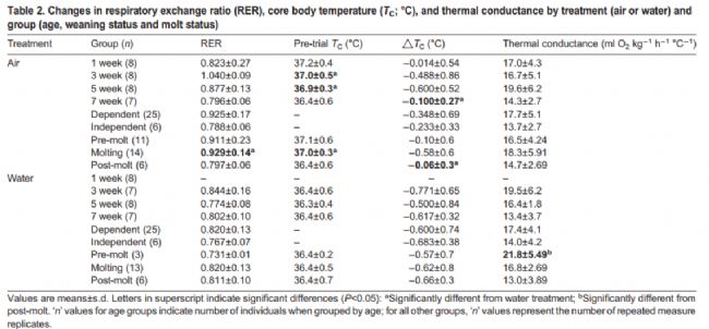 Table2.呼吸氣體交換比率(RER)、核心體溫和不同處理(空氣或水體)以及分組(年齡、斷奶和蛻皮狀態)下的熱傳導變化。RER從0.796±0.06到1.040±0.09(空氣中)以及0.774±0.08到0.844±0.16(水體中)變化;不同處理和年齡組間無明顯差異;一個處理內,蛻皮組之間無明顯差異;處理組之間,蛻皮幼體空氣中的RER顯著高于水體中的值(P=0.0437;Table2),其它RER無明顯差異。