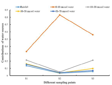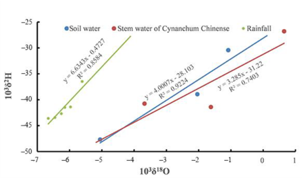 作者于2019年8月12日收集了降雨。并于2019年8月20日、2019年8月22日和2019年8月24日收集了3個不同地點的戟葉鵝絨藤莖部和不同層土壤(0-10 cm、10-30 cm、30-50 cm和50-70 cm)樣品。利用全自動真空冷凝抽提系統(LI-2100,北京理加聯合科技有限公司)提取土壤和植物莖中的水分。