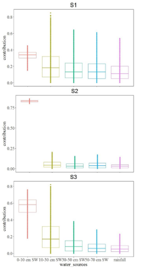 植被根系水分吸收在水分運移過程中發揮著重要作用,且在土壤-植物-大氣界面具有多重影響,尤其是半干旱和干旱生態系統中。具有高生態可塑性的各種荒漠物種的根系水分吸收模式適應了有效水資源,從而產生了物種特異性抗旱機制。因此,測量根系活動和量化每個貢獻者大小的定性和定量方法,特別是在(半)干旱地區,尚未得到廣泛研究,并且仍然是當前研究工作的挑戰。已有許多研究應用水穩定同位素方法研究了植物的吸水模式,但研究對象多集中在樹木和灌木上,且許多文獻提到干旱地區不可預測的降水事件對最常見的植物吸水模式的顯著影響。