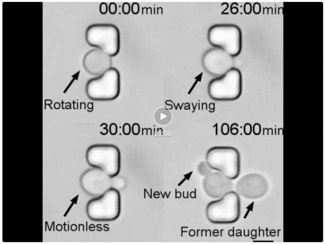 接下來,研究人員在高通量單細胞長時間培養(yǎng)過程中,通過視頻拍攝觀測并驗證了母細胞在初始出芽時的動態(tài)旋轉,并在芽稍大時重新定向至“瓶頸”處,且停止旋轉直到胞質分裂完成后被解剖分離。通過時序成像,驗證了母細胞在多代子細胞之間,面臨隨機的出芽位點依然能夠實現穩(wěn)定的“瓶頸”定向和子細胞剪切。