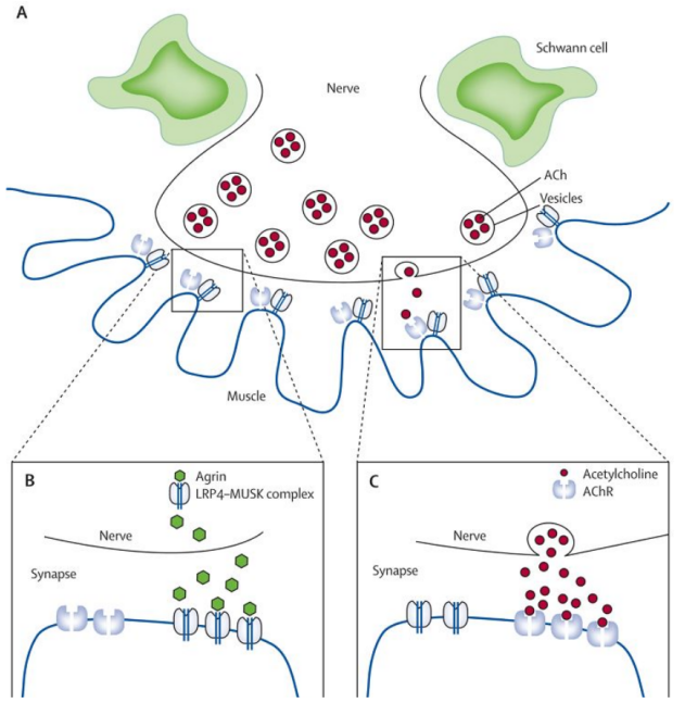 MuSK,將乙酰膽堿酯酶錨定在突觸基膜上。