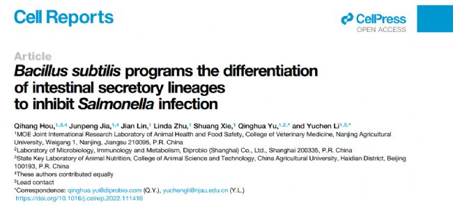 2022年9月27日,學術期刊《Cell Reports》在線發表,南京農業大學動物醫學院青年教師李昱辰為通訊作者,其團隊研究成果“ Bacillus subtilis programs the differentiation of intestinal secretory lineages to inhibit Salmonella infection ”。