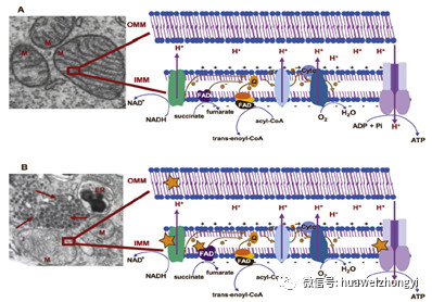 圖1.線粒體呼吸鏈和氧化磷酸化:(a)人肝細胞的電子透射顯微照片,顯示線粒體(M)帶有電子致密cr。(b)感染登革熱病毒的人類肝細胞的電子傳輸顯微照片(電子致密顆粒;箭頭)。病毒顆粒(紅色箭頭)位于線粒體(M)和內質網(ER)附近。[YL1]