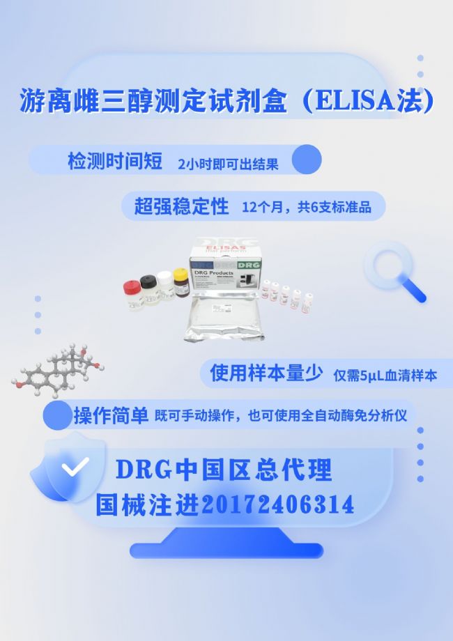 科潤達生物代理的德國DRG的游離雌三醇試劑盒,是一種酶聯免疫試劑盒,可用于孕婦中孕期血清游離雌三醇的體外定量檢測。該試劑盒已經取得國家藥品監督管理局的注冊證,可以用于臨床檢驗。