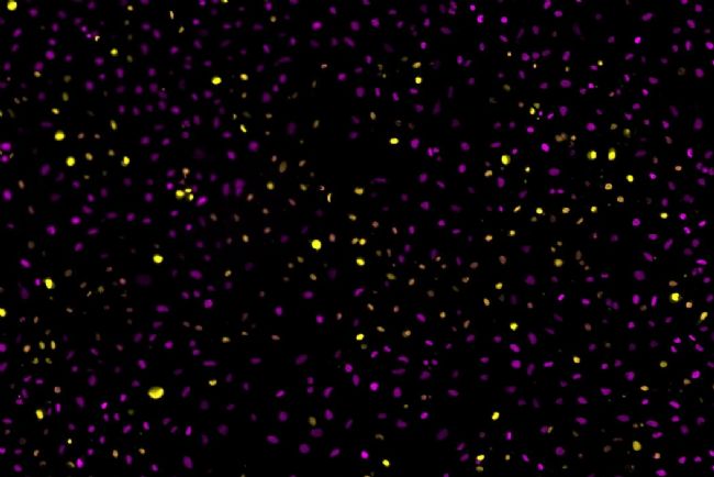 圖像:雙色caspase檢測并進(jìn)行拼接掃描。U2OS細(xì)胞用核標(biāo)記物DRAQ5(品紅)和CellEvent™(黃色)標(biāo)記。加入4mM星形孢菌素以誘導(dǎo)細(xì)胞凋亡。20倍物鏡下使用雙通道熒光,持續(xù)16小時每30分鐘獲取一次2x2 FOV(視野范圍)的掃描拼接圖像。