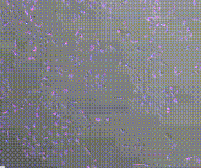 視頻 2:三色caspase活性檢測的掃描拼接片。U2OS細(xì)胞分別用核標(biāo)記SPY-650-DNA(藍(lán)色)、線粒體膜電位標(biāo)記TMRE(品紅)和CellEvent™(黃色)處理。加入5mM星形孢菌素以誘導(dǎo)細(xì)胞凋亡。使用20x物鏡,在明亮視野和兩種熒光通道下,12小時內(nèi)每15分鐘獲取一次2x2 FOVs(視野范圍)的掃描拼接圖像。隨著時間增加,Caspase活性增強(qiáng),線粒體活性減弱。