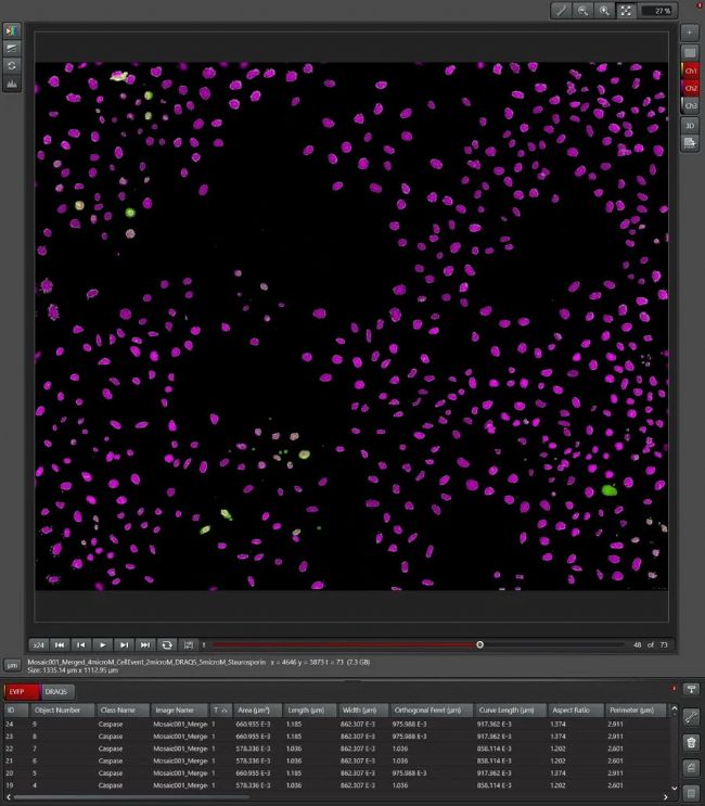 SPY-650-DNA(標(biāo)記細(xì)胞核)和CellEvent™(標(biāo)記caspase 3/7活性)兩種細(xì)胞染料的量化研究揭示了在活細(xì)胞實驗中發(fā)生caspase介導(dǎo)的凋亡的細(xì)胞。細(xì)胞核的數(shù)量(此處選擇“范圍”參數(shù)做類比)說明了每張圖像中細(xì)胞的數(shù)量(同選“范圍”),可與處于凋亡過程中細(xì)胞的數(shù)量(同選“范圍”)相對應(yīng)。另一個標(biāo)記,即TMRE成像過程,揭示了線粒體活性。